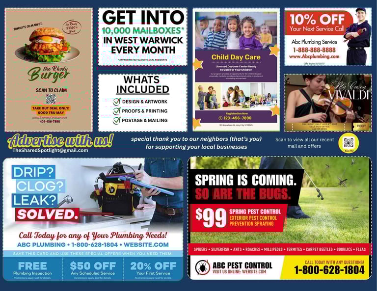 The Shared Spotlight brings 16 local businesses together on one jumbo 9×12 postcard — mailed directly to thousands of homes in your community. Shared cost. Exclusive category. Maximum exposure.